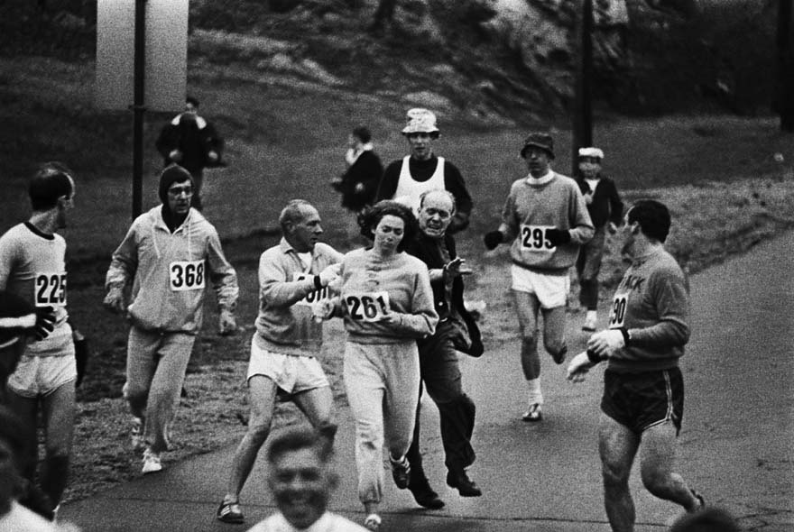 7. Los organizadores de carreras intentan detener a Kathrine Switzer en el maratón de Boston. Ella fue la primera mujer en terminar la carrera, 1967